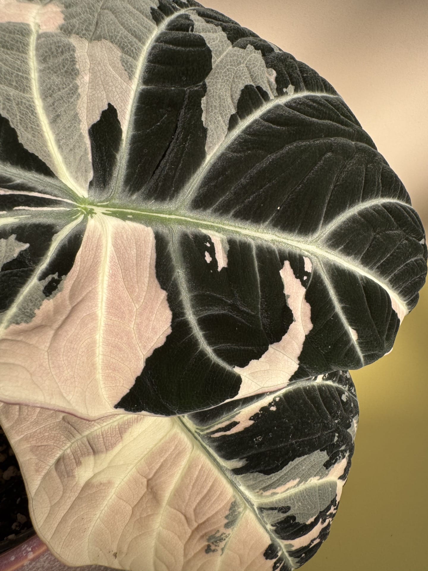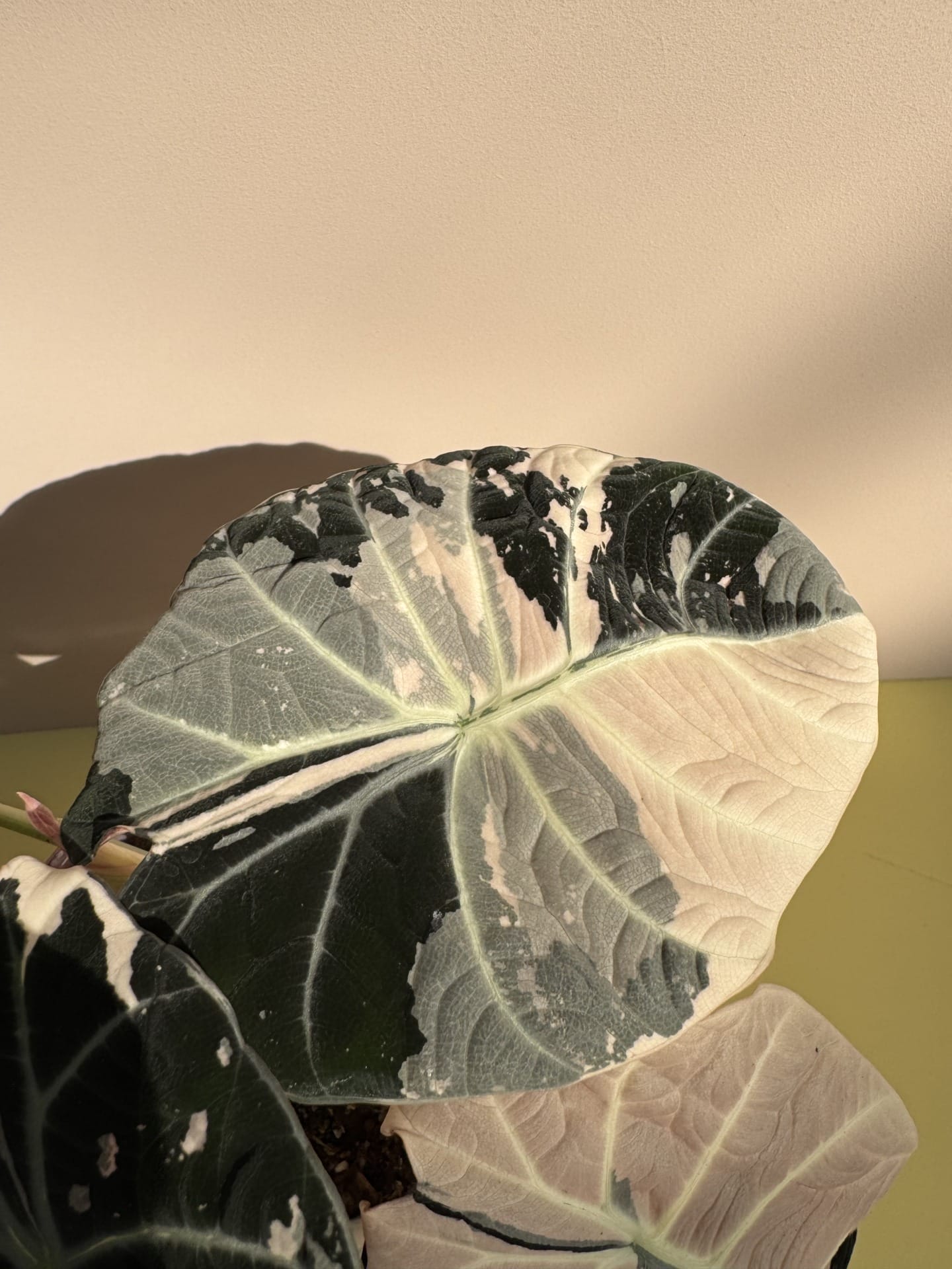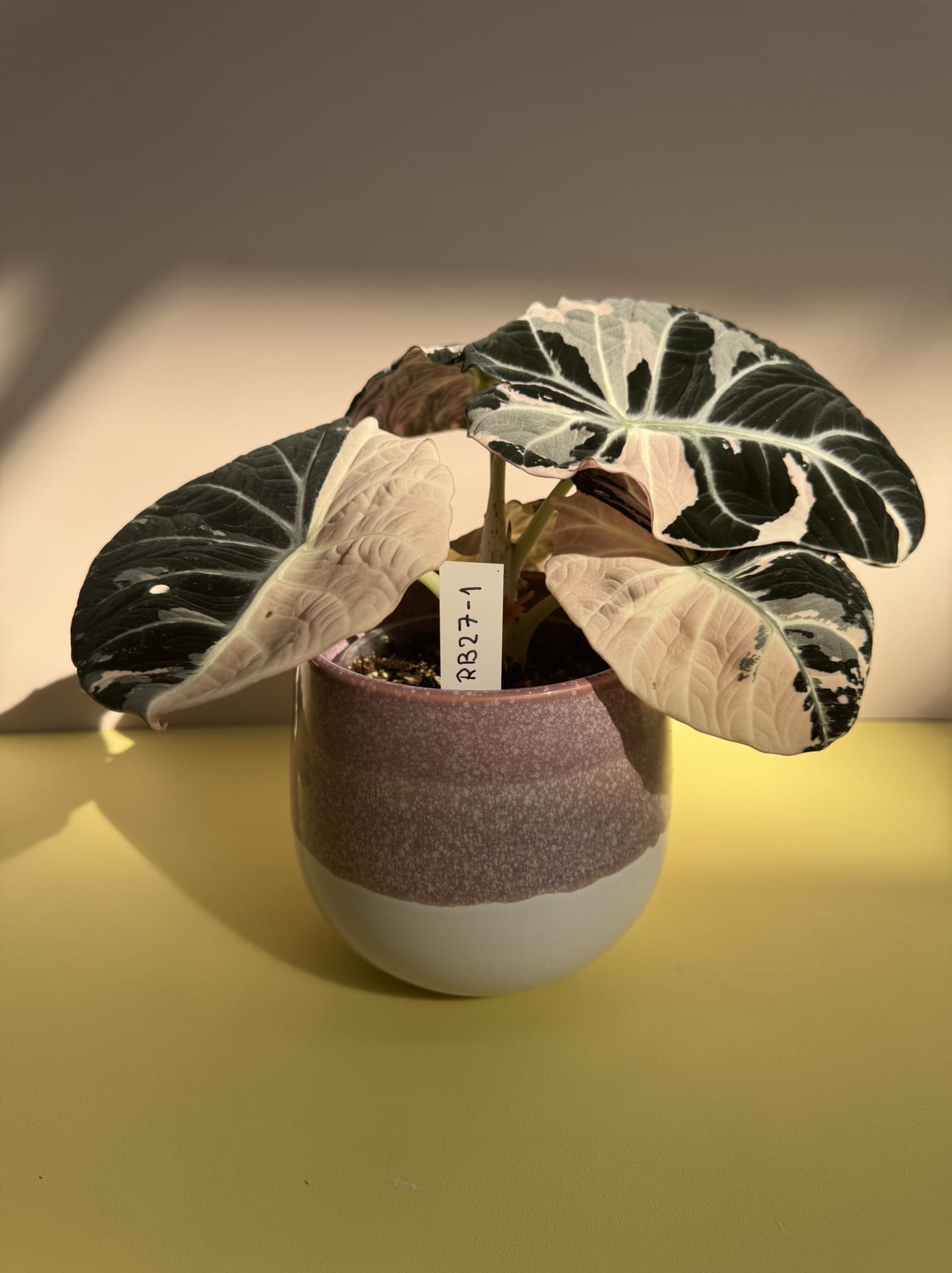Alocasia Black Velvet Pink Albo Variegata er en slående og sjælden plante, der er elsket for sin unikke blanding af rosa, hvide og sorte nuancer. Dens fløjlsagtige blade giver en blød, luksuriøs tekstur, som gør den til en ægte oplevelse. Når de nye blade kommer frem, kan de vise lysere rosa eller hvide toner, mens de modne blade bliver dybere og får kraftigere rosa nuancer. Når planten står i sollys, bliver de rosa farver smukt levende, hvilket gør den endnu mere iøjnefaldende.