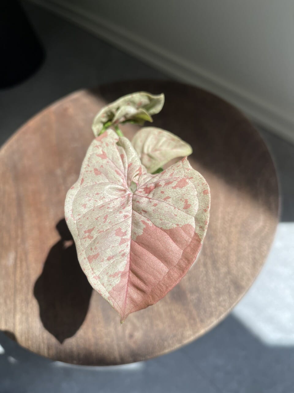 Bladene på Syngonium Pink Marble har en fortryllende blanding af lyserøde, grønne og cremefarvede nuancer. Det marmorerede mønster varierer fra blad til blad, hvilket skaber et visuelt slående og evigt skiftende display. Bladene starter typisk med en lyserød nuance og udvikler gradvist en mere udtalt brogethed, efterhånden som de modnes.