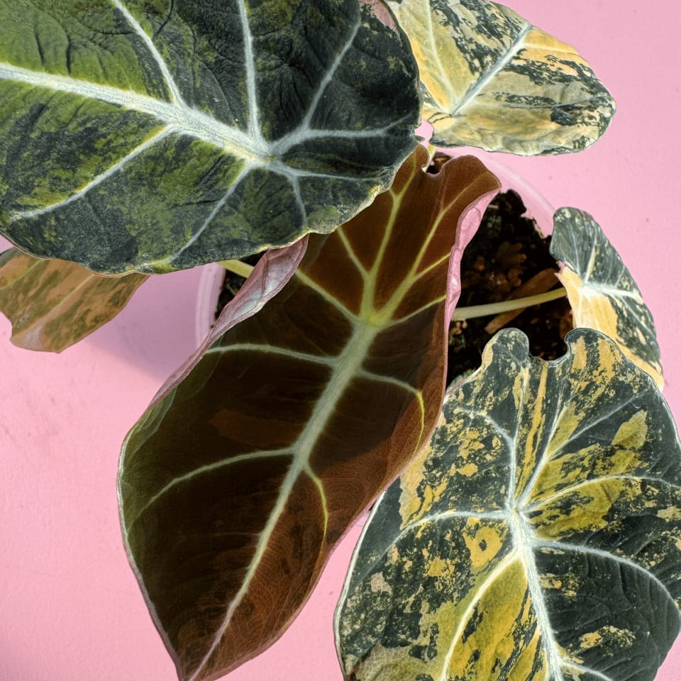 Meet the rare Alocasia Black Velvet Variegata, showcasing stunning golden variegation. As the leaves mature, they develop into a vibrant deep yellow. New leaves may start off darker green, but with plenty of light, they’ll brighten up beautifully. The pictures highlight the older leaves, which display their rich colour. This batch of plants has strong variegation qualities, making it a safer choice when selecting strong genetics.