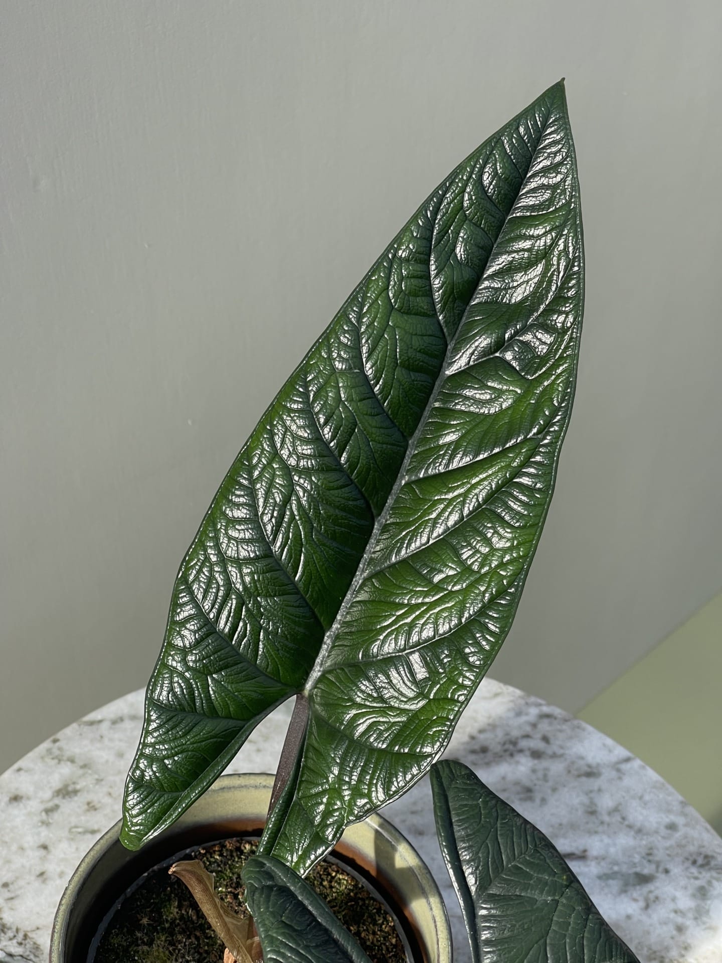 This Alocasia Scalprum comes in a 12 cm pot and features dark green, elongated leaves with a rich, textured appearance. Its glossy, almost leather-like surface and intricate veining give it a bold and captivating look. Perfect for anyone looking to add a touch of dramatic greenery to their collection, this Alocasia is sure to stand out.